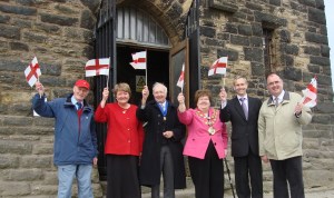 I attended the Civic Flag raising ceremony outside the Town Hall at 9 am then made my way up (on foot I hasten to add) to he top of Holcombe Hill to join Councillor Theckston from Ramsbottom who has for a number of years been arranging for the Cross of St. George flag to fly from the top of Peel Tower each St.George’s Day. We were later joined by the Mayor and Deputy Mayor. I climbed to the top of the Tower and the view as ever was spectacular.