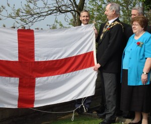 As St. George’s Day falls during the Easter Holiday weekend this year the Civic Flag Raising ceremony took place on Thursday 21st April. I attended along with the Mayor of Bury the Deputy Mayor, Mr Ivan Lewis the MP for Bury South, Cllr Bob Bibby the Council Leader and Cllr Yvonne Creswell the Deputy Leader. Prior to the flag raising ceremony the Rector of Bury Reverend John Findon gave a brief talk on the history of St. George and said prayers.